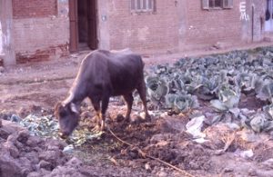 Un búfalo atado en las afueras de una ciudad egipcia