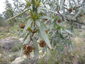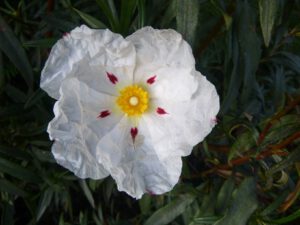 La jara común es un arbusto siempreverde del Mediterráneo occidental, en suelos sin cal, de las hojas en verano sale una oleorresina.