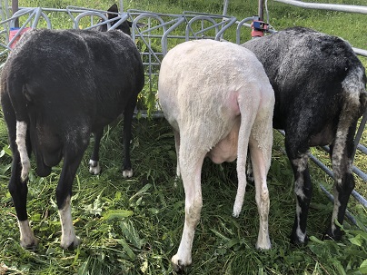 Ovejas lecheras fijadas en el pasto para el ordeño